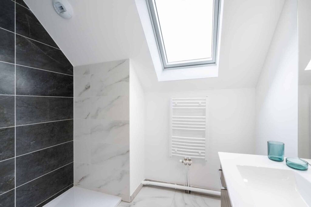 - Carrelage grand format (60×60) dans cuisine et salle de bain